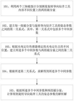 7.根据权利要求6所述的方法,其特征在于,所述根据所述多个中间参数和两组磁分量,计算得到旋转导向钻井工具的姿态参数包括:通过如下公式计算旋转导向钻井工具的实时工具面角T:通过如下公式计算cos(α1‑α2):cos(α1‑α2)=M1·M2+N1·N2+bZ1·bZ2; (10)根据测量点所在的南、北半球位置确定当地磁倾角α1、α2的区间,综合 的变化梯度,确定sin(α1‑α2)的符号,根据cos(α1‑α2)计算得到sin(α1‑α2);