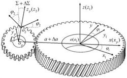 在实际剃齿加工中,剃齿刀和工件齿轮的轴交角误差ΔΣ、中心距误差Δa和两个高速轴的同步误差Δω1和Δω2都会反映到工件的齿向误差上,因此针对这4个误差参数建立剃齿啮合点几何模型;