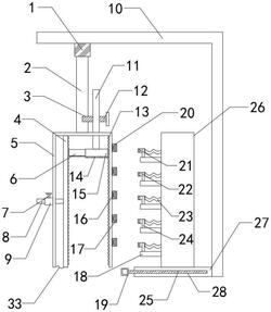 4.根据权利要求1所述的室内土壤微生物呼吸连续测定装置,其特征在于,所述竖向间距调节件包括调节杆二(11),所述调节杆二(11)穿过取样框(5)与调节外板(15)连接,所述调节外板(15)套设在调节内板(6)的外侧,所述调节外板(15)内设置有连接槽(32),所述调节内板(6)通过弹力件(31)与连接槽(32)连接,所述调节内板(6)和调节外板(15)的下端均设置有软质垫(14),还包括调节螺纹销二(12),所述调节杆二(11)上设置有多个与调节螺纹销二(12)配合的螺纹孔二(29),所述推动杆(2)上设置有螺纹孔三(3),所述支撑底板(27)内设置有卡接槽(28),所述卡接槽(28)内卡接有阻隔板(25),所述阻隔板(25)与拿持把手(19)连接。