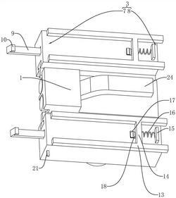 1.一种混凝土钢筋保护层厚度检测装置,包括钢筋探测仪(1),其特征在于:所述钢筋探测仪(1)的两侧分别固定连接有滑行块(2),所述钢筋探测仪(1)的两侧均设有夹持块(3),所述夹持块(3)的侧面上固定连接有吸盘(4),两个所述夹持块(3)朝钢筋探测仪(1)的一侧均开有供滑行块(2)插入并滑动的滑行槽(5),所述滑行槽(5)的的两端槽口处均固定连接有朝钢筋探测仪(1)方向凸起的限位块(6);所述钢筋探测仪(1)上固定连接有推动杆(24),所述推动杆(24)远离钢筋探测仪(1)的一侧高于夹持块(3)的上端面;所述夹持块(3)包括拼接部(7)以及连接部(8),所述拼接部(7)的端部固定连接有可形变的卡接块(9),所述卡接块(9)的端头固定连接有定位头(10),所述连接部(8)处开有供相邻的夹持块(3)的卡接块(9)插入的卡接槽(25),所述连接部(8)处还开有与卡接槽(25)垂直开设的定位槽(11),所述定位头(10)能够穿过卡接槽(25)插入至定位槽(11)内;所述定位槽(11)内还滑动连接有跳动件(12),所述连接部(8)的外侧壁上滑动连接有两个驱动块(13),所述驱动块(13)的长度与夹持块(3)的长度相同,所述定位槽(11)位于两个所述驱动块(13)之间,所述驱动块(13)之间还设有与驱动块(13)固定连接的复位块(14)以及与夹持块(3)固定连接的凸起块(15),所述复位块(14)能对定位槽(11)进行密封,所述复位块(14)与凸起块(15)之间还固定连接有复位弹簧(16),所述跳动件(12)远离定位头(10)的一端固定连接有防滑件(17),所述跳动件(12)朝复位块(14)的一侧设有倾斜端(18)。