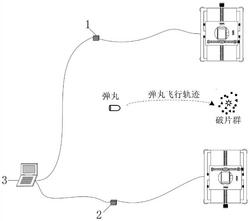 步骤3、通过电机(2)带动转轴(22)转动,进而带动广场相机转动到设定角度,角度编码器读取两组图像测试单元中广场相机(17)转动的角度值,分别记为θ1与θ2;弹丸处于远离两组图像测试单元中间的位置,当弹丸爆炸时,弹丸爆炸产生的破片群分布在两个光场相机(17)的交汇视场中,图像采集仪(1)连续接收并处理两个光场相机(17)所采集到的图片,获得破片成像像素坐标;