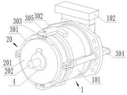 所述刹车机构包括两子刹车组件,所述子刹车组件包括刹车片、弹簧、支架、L型连杆,所述刹车片包括弧形块、位于所述弧形块内轮廓中间的移动块、分别连接于所述弧形块两端的两平板;两所述子刹车组件呈对称设置,两所述弧形块外包所述输出耦合外壳,所述输出耦合外壳上对称设有两移动槽,两所述移动块分别插入至两所述移动槽内并伸入至所述输出耦合外壳内,所述移动块的工作面呈与所述第一耦合壳体外表面相配合的弧形结构;