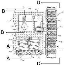 10.如权利要求1所述一种根据行驶道路情况自动调节履带张紧情况的坦克履带调节器,其特征在于:所述设定空间(39)中的所述第一液压伸缩杆(28)和所述第二液压伸缩杆(29)的压缩情况代表了在该检测路段上,附着系数和滚动阻力系数之间的差值大小,差值越大,随后设定时,所述启动块(26)滑动的距离越大,此时所述转动件(56)和所述导向轮(13)的转动角度越大,拉紧或者放松的程度越大,从而增大的附着牵引力和减小的滚动阻力越大,越有利于车辆的行驶。