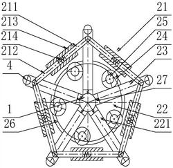 1.一种高度可调节的拨禾装置,包括旋转轴(1),固定装设于所述旋转轴(1)上的拨禾轮A(2)和拨禾轮B(3),两端分别与所述拨禾轮A(2)和所述拨禾轮B(3)相连且平行于所述旋转轴(1)装设的拨禾杆(4);其特征在于:所述拨禾轮A(2)和拨禾轮B(3)结构完全相同,呈正五边形结构;均包括固定装设于所述旋转轴(1)上的同步圆盘(22),五根结构完全相同且轴对称径向滑动装设于所述同步圆盘(22)上的径向移动杆(23),五个结构完全相同且轴对称转动装设于所述同步圆盘(22)上的复合齿轮,五个结构完全相同且两端分别铰接装设于相邻的两个所述径向移动杆(23)外端部的周向伸缩机构(21);