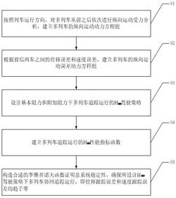 上第i辆列车的实际加速度;di(t)代表列车运行方向上第i辆列车运行过程中受到的额外附加阻力;S2、根据前后两车之间的位移误差和速度误差,建立多列车的纵向运动误差动力方程组;所述步骤S2包括如下步骤:S2.1、设定多列车运行方向上头车的期望位移跟踪曲线为xd(t),且其一阶导数和二阶导数均存在;S2.2、构造多列车运行方向上头车的位移跟踪误差e1(t)和速度跟踪误差S2.3、构造多列车运行方向上第i(i>1)辆列车的位移跟踪误差ei(t)和速度跟踪误差其中,Δi‑1,i代表多列车运行方向上前后两车的期望运行间距,即多列车运行方向上第i‑1辆车和第i辆车的期望运行间距,且Δi‑1,i>0;S2.4、定义新变量结合多列车纵向运动动力方程组和步骤S2.2、S2.3,整理得多列车的纵向运动误差动力方程组:其中,S3、设计基本运行阻力和额外附加阻力下多列车协同追踪运行的H∞驾驶策略;H∞驾驶策略的控制器为:其中,ui(t)代表多列车运行方向上第i辆列车的控制输入;Ki代表多列车运行方向上第i辆列车的控制器系数,所述Ki通过仿真实验求出;S4、建立多列车协同追踪运行的H∞性能指标函数;所述步骤S4包括如下步骤:S4.1、定义输出函数其中,C=diag{C1,C2,…,Cn},C1,C2,…,Cn均为已知适维矩阵;S4.2、建立H∞性能指标函数:其中,zT(τ)代表z(τ)的转置;τ代表时间变量;γ=diag{γ1,γ2,…,γn},且γ1,γ 2 ,… ,γ n 为通过仿真实验得到的>0 的值;代表的转置,且S5、构造李雅普诺夫函数;证明所述H∞驾驶策略下所述多列车能够协同追踪运行;构造总系统的候选李雅普诺夫函数V(t):其中,结合H∞性能指标函数J(t)和李雅普诺夫函数V(t)的一阶导函数,分析整理得:J(t)<0,证明所述H∞驾驶策略下所述多列车能够协同追踪运行。