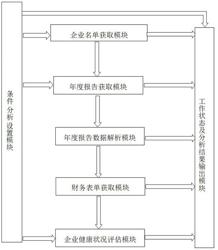 企业名单获取模块、年度报告获取模块、年度报告数据解析模块、财务表单获取模块和企业健康状况评估模块的工作状态实时输出至工作状态及分析结果输出模块,工作状态及分析结果输出模块进行实时输出显示并存储。