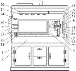 1.一种可均匀照射的儿科医生用黄疸治疗装置,包括机体(1)、治疗室(2)、电机(6)、蓝光灯(21)和睡箱(27),其特征在于:所述机体(1)的上端内部开设有治疗室(2),且机体(1)的左侧开设有通口(3),并且机体(1)的左侧外部安装有封闭门(4),所述治疗室(2)的左侧内壁固定有固定架(5),且固定架(5)的内部嵌入安装有电机(6),所述电机(6)的输出端键连接有驱动齿轮(7),且驱动齿轮(7)的端部固定有圆柱(8),所述圆柱(8)位于凹槽(9)的内部,且凹槽(9)开设于圆盘(10)的侧部,并且圆盘(10)轴连接于固定架(5)的右侧内部,所述圆盘(10)的一侧贯穿固定架(5)的右侧内部连接有转块(11),且转块(11)的右侧开设有通槽(12),所述通槽(12)的内部设置有调节杆(13),且调节杆(13)的一侧安装有连接块(14),并且连接块(14)的一侧轴连接有转杆(15),所述转杆(15)的一端和中部分别轴连接有第一活动块(16)和第二活动块(18),且第一活动块(16)和第二活动块(18)分别位于第一滑槽(17)和第二滑槽(19)的内部,所述转杆(15)的另一端安装有灯架(20),且灯架(20)的底部固定有蓝光灯(21),所述固定架(5)的左侧轴连接有放置架(24),且放置架(24)的端轴连接于治疗室(2)的左侧内壁,所述放置架(24)的内部安装有滑轨(26),且滑轨(26)的一端安装有睡箱(27);