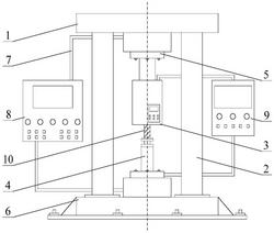 1.一种变频变强度动静组合加载岩石力学试验机,其特征在于,包括顶梁、立柱、动载施加装置、静载施加装置、监测装置、底座、加载控制系统和信号采集装置,其中,顶梁通过立柱连接至底座,底座上设置静载施加装置,静载施加装置上方的顶梁上设置动载施加装置,静载施加装置和动载施加装置均连接至加载控制系统,试验机上还设置有监测装置,监测装置连接至信号采集装置。