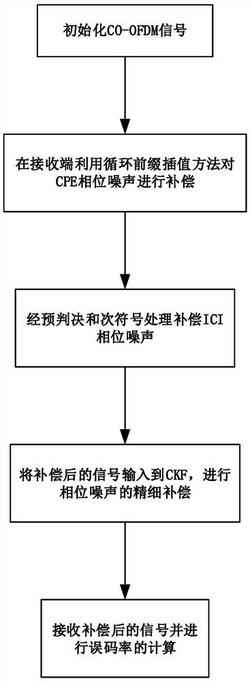 1.CO‑OFDM系统中基于CP插值与CKF的相位噪声补偿方法,在第一阶利用循环前缀(Cyclic Prefix,CP)进行插值,消除了公共相位误差(Common Phase Error,CPE)噪声,对一阶补偿后的信号进行预判决,然后通过划分次符号,消除部分载波间干扰(Inter‑Carrier Interference,ICI),最后利用容积卡尔曼滤波(Cubature Kalman Filter,CKF)对信号的残余相位噪声进行处理,其特征在于,具体包括以下步骤:(1)在初步补偿的是利用线性插值方法,该方法是基于传统的线性方法提出的,传统的线性插值在一个OFDM符号内只有一个线性插值点 该方法能有效地估计相位噪声,但是在线宽较大的时候,相位噪声起伏较大,只通过一个有效的估计值已经无法准确的估计相位噪声值,本方法通过增加相位噪声的插值点数加大对相位噪声的消除力度;