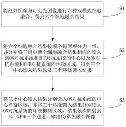将三个中心馈入结果分别馈入ON对抗系统的中心兴奋区域,并将三个环绕馈入结果分别馈入ON对抗系统的环绕抑制区域,结果依次映射到B、G和R三个通道,输出伪彩色融合图像;