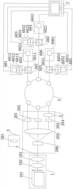 所述检偏系统(6)包括检偏单元一(601)、检偏单元二(602)、检偏单元三(603)、检偏单元四(604)、检偏单元五(605)和检偏单元六(606),检偏单元一(601)、检偏单元二(602)分别设置在分光单元一(501)的反射光路和透射光路上;检偏单元三(603)、检偏单元四(604)分别设置在分光单元二(502)的反射光路和透射光路上;检偏单元五(605)、检偏单元六(606)分别设置在分光单元三(503)的反射光路和透射光路上;检偏单元一(601)包括沿着光的传输方向依次设置的1/4波片b(6013)、偏振片e(6012)和探测器a(6011),1/4波片b(6013)调节到与水平成+45°方向或‑45°方向,偏振片e(6012)调节到水平方向;检偏单元二(602)包括微偏振探测器a(6021);检偏单元三(603)包括沿着光的传输方向依次设置的1/4波片c(6033)、偏振片f(6032)和探测器b(6031),1/4波片c(6033)调节到与水平成+45°方向或‑45°方向,偏振片f(6032)调节到水平方向;检偏单元四(604)包括微偏振探测器b(6041);检偏单元五(605)包括沿着光的传输方向依次设置的1/4波片d(6053)、偏振片g(6052)和探测器c(6051),1/4波片d(6053)调节到与水平成+45°方向或‑45°方向,偏振片g(6052)调节到水平方向;检偏单元六(606)包括微偏振探测器c(6061);