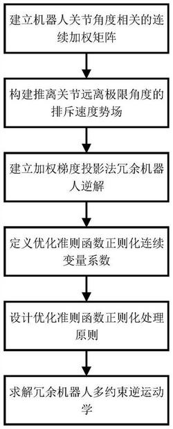 排斥速度势场函数Tr作用于冗余机器人末端m维度主任务 的所述加权零空间矩阵内,建立加权梯度投影法冗余机器人逆解,为:其中 为机器人关节速度;