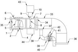 第二步:系统使用时浮球(25)不仅仅可以起到确定液位高度的作用,还可以联动起到触发作用,当系统内部的液位过低达到阈值时,此时系统内部流体的流速以及液体压力也会跟着低到阈值以下,此时浮球(25)下移位置较低,使得第二强磁铁(15)与第一弹性片(27)和第二弹性片(29)靠近此时通过第二强磁铁(15)即可将铁质的第一弹性片(27)和第二弹性片(29)磁化,从而使得第一弹性片(27)和第二弹性片(29)通过磁力吸附靠近,使得第一触点(28)和第二触点(30)接触,如此即可使得电磁阀(37)通电打开,随后液体即可进入到支管(38)内部,随后通过电动机(42)带动叶轮(40)转动,即可对液体进行加压使得液体通过支管(38)进行流动,从而使得流体获得需要的压力和流速;