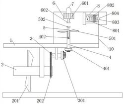 壳(1);所述水流速监测外壳(1)内侧底部设置有流体随动机构,所述水流速监测外壳(1)内部顶侧设置有热量触发机构;所述流体随动机构包括:转轴A(2)、扇叶A(201)、链条(202)、转轴B(3)、伞齿轮A(301);所述水流速监测外壳(1)内部一侧转动安装有转轴A(2),所述转轴A(2)一侧固定安装有扇叶A(201),且扇叶A(201)数量为若干个,所述转轴A(2)另一侧通过链条(202)活动连接有转轴B(3),且转轴B(3)转动连接于水流速监测外壳(1)底部,所述转轴B(3)一侧固定安装有伞齿轮A(301);所述热量触发机构包括:转轴C(4)、伞齿轮B(401)、弹簧A(402)、转轴D(5)、扇叶B(501)、咬合盘(502)、发电机(6)、转轴E(601)、咬合盘B(602)、警报发射器(7)、密封腔(10);所述水流速监测外壳(1)上方一侧固定安装有密封腔(10),所述密封腔(10)底部一侧转动安装有转轴C(4),所述转轴C(4)底部固定安装有伞齿轮B(401),伞齿轮A(301)与伞齿轮B(401)齿轮互相咬合,且伞齿轮A(301)与伞齿轮B(401)齿数比为9:5,所述转轴C(4)上侧内腔底部通过弹簧A(402)弹性连接有转轴D(5),且转轴D(5)与转轴C(4)内腔两侧活动连接,所述转轴D(5)一侧固定安装有扇叶B(501),且扇叶B(501)数量为2个,所述转轴D(5)顶侧固定安装有咬合盘(502),所述密封腔(10)内部上侧固定安装有发电机(6),所述发电机(6)底侧嵌入旋转安装有转轴E(601),所述转轴E(601)底部固定安装有咬合盘B(602),且咬合盘(502)与咬合盘B(602)位置对应且配套设置,所述发电机(6)上侧串联连接有警报发射器(7);