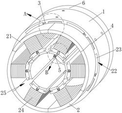 1.一种高效型屏蔽电泵用定子结构,其特征在于,包括固定套(1),在所述固定套(1)的内部安装定子结构(2);所述定子结构(2)包括定子铁芯(21),多个定子铁芯(21)成环形阵列设置在所述固定套(1)的内部,在所述定子铁芯(21)上固定连接有安装块(23),在所述固定套(1)上成环形阵列设置多个与安装块(23)对应的安装槽(22),所述定子铁芯(21)通过安装块(23)插入安装槽(22)内部与固定套(1)进行连接固定;在每相邻两个所述定子铁芯(21)之间设置呈扇形的绕线槽(25),所述安装槽(22)和安装块(23)均成扇形结构,所述定子铁芯(21)外部缠绕定子线圈(24),所述定子线圈(24)的线径和匝数分别为0.25‑0.21mm和800‑630匝;