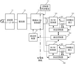 副边控制器,该副边控制器从所述多个协议控制器接收所述多个输出接口的充电需求,并对所述原边控制器输出控制信号,以调整所述隔离DC/DC变换器输出的所述隔离后直流电压。