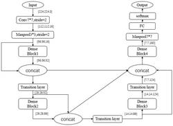 所述分类模块包括:依次连接的卷积层、第一最大池化层、第一密集块、第一过渡层、第二密集块、第二过渡层、第三密集块、第三过渡层、第四密集块、第二最大池化层、全连接层和softmax分类器;还包括:在第二密集块、第三密集块、第四密集块前建立连接,使每一层的输入来自之前所有层的输出;
