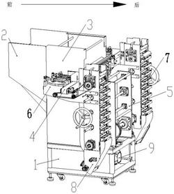 所述间距调节机构(5)设置在所述机架(1)上对应所述输料机构(4)后部的位置,两个所述排种机构(7)分别可滑动的安装在所述间距调节机构(5)上的两侧;两个所述充种机构(6)与两个所述排种机构(7)一一对应设置,所述充种机构(6)固定在相对应的所述排种机构(7)的上部,并且相对应的所述充种机构(6)与所述排种机构(7)的上部分别处于所述输料机构(4)一端的前后两侧;所述充种机构(6)可前后来回运动以将所述输料机构(4)输送预设距离的木薯种(10)向后推入到相对应的所述排种机构(7)的上部内,所述排种机构(7)可上下循环转动设置以承接所述充种机构(6)推入的木薯种(10)并使木薯种(10)保持水平状向下输送;两个所述出种调姿机构(8)分别设置在相对应的所述排种机构(7)的底部以承接住所述排种机构(7)向下输送的水平状木薯种(10),并且所述出种调姿机构(8)可摆动设置以将承接住的水平状木薯种(10)扶正成竖直状并向下插入到需要播种的位置;所述电机(9)固定在所述机架(1)上,其分别连接所述调姿分料机构(3)、所述输料机构(4)、所述充种机构(6)、所述排种机构(7)和所述出种调姿机构(8),并带动所述调姿分料机构(3)上下往复运动、带动所述输料机构(4)水平循环转动、带动所述充种机构(6)前后来回运动、带动所述排种机构(7)上下循环转动以及带动所述出种调姿机构(8)摆动;