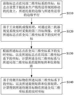 3.根据权利要求1所述的方法,其特征在于,根据所述标志点在全局二维坐标系下的实时坐标,以及所述标志点在局部二维坐标系下的坐标,计算所述全局二维坐标系与所述局部二维坐标系的旋转矩阵和位移矩阵,包括:根据所述全局二维坐标系与所述局部二维坐标系的X轴和Y轴,并且根据流水生产线垂直的方向为Z轴,建立全局三维坐标系和局部三维坐标系;