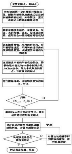 步骤9:拓展 节点的过程中,没有考虑车辆周围的障碍物,拓展的模拟路径难以保证车辆避障,这里采用RS曲线间接解决车辆避障问题,RS曲线虽然不能避障,但突出优点是计算速度快,RS曲线由不同的圆弧和直线段组成,总是可以在平面内连接任意位置的位姿,设置迭代次数 ,直到连接起点和终点的RS曲线能够避开障碍物为止,退出RS模式,为进一步提高车辆的实时性,没有必要在每一次拓展节点的过程中都使用RS曲线连接 和,仅仅在障碍物分布密集的场景及前向模拟的路径不能避障使下用;步骤10:判断 ,如果是,则判定规划成功,输出最终轨迹 ,最终轨迹 由close表中的节点组成,节点之间是模拟轨或RS曲线连接,如果否,则返回步骤7,8,直到满足条件为止;步骤11:将最终轨迹 作为轨迹跟踪的参考轨迹,设计轨迹跟踪自适应模型预测控制器,具体包括:车辆模型线性化、离散化,组合状态量与控制量的状态空间模型、计算预测模型的输出量、状态量与控制量及其增量的约束条件设计、权重矩阵Q、R调整、目标函数的滚动优化求解、控制增量的反馈校正、由曲率计算的纵向速度更新预测模型的输出量;