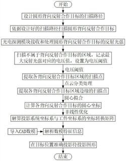 步骤三、建立投影系统坐标系与工件坐标系的坐标转换关系:光电探测器模块接收和处理圆形背向反射合作目标及其周围区域反射的光强信号,并将其转化为电压信号;记录在背向反射合作目标周围但不属于合作目标的区域的扫描点电压信号,提取其中最大的电压值设置为电压阈值;根据电压阈值,提取各圆形背向反射合作目标区域的扫描点;通过点云处理,提取背向反射合作目标区域边缘的边缘扫描点;利用边缘扫描点解算各背向反射合作目标的圆心坐标;根据各圆形背向反射合作目标分别在投影系统坐标系和工件坐标系下的坐标,求解坐标转换矩阵参数,确定两坐标系的坐标转换关系;