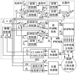 1.一种交流伺服驱动方法,其特征在于,包括位置环、速度环、电流环,每个环路由反馈控制器和前馈控制器组成,所述反馈控制器用于检测伺服对象的实时状态,将目标值与真实值比较分析;反馈控制器为比例调节器或比例积分调节器,所述前馈控制器为基于控制对象的数学模型;