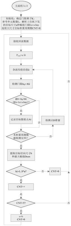 S10、判断大尺寸目标连续积累周期计数是否大于5,若大于,则连续5个积累周期解析的真实目标径向尺寸b大于上位机下发的初始目标尺寸的1.3倍,以最近一个积累周期解析的真实目标径向尺寸b代替a,CNT=0,进入S2,循环重复下一个积累周期数据的处理。