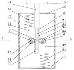 1.一种阻尼力正比于振动位移的金属隔振器,包括外壳(12),分别装设于所述外壳(12)上、下两端的底板(11)和上盖(13),穿过所述上盖(13)自由升降的升降柱(14),固定装设在所述升降柱(14)上端的隔振平台(15);其特征在于:所述升降柱(14)的下端固定装设有双侧错位分段齿条(2),所述双侧错位分段齿条(2)左右两侧沿水平方向对称装设有的上行转轴(7)和下行转轴(6),所述上行转轴(7)上固定装设有上行齿轮(44)和上行绕线轮(43),所述下行转轴(6)上固定装设有下行齿轮(34)和下行绕线轮(33),所述底板(11)上装设有下行螺旋弹簧(31),所述上盖(13)上装设有上行螺旋弹簧(41);