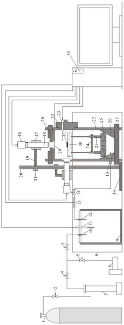 1.一种可视化页岩吸附变形试验装置,其特征在于:包括压力控制系统和吸附检测系统;所述压力控制系统包括压力控制部和气体参考槽(9),所述压力控制部通过第五管道与气体参考槽(9)连通,所述气体参考槽(9)内设置有第一温度传感器(11),所述吸附检测系统包括与所述气体参考槽(9)连通的吸附罐,所述压力控制部用于向所述气体参考槽(9)和吸附罐内加注或抽出气体,所述吸附罐内设置有载物台(30)和第二温度传感器(33),所述吸附罐外侧设置有显微镜(18),所述显微镜(18)固定连接的采集相机(16),所述显微镜(18)的物镜与所述载物台(30)相对设置;所述第一温度传感器(11)、第二温度传感器(33)和采集相机(16)均与数据采集分析部电性连接,所述气体参考槽(9)周侧和所述吸附罐下端设置有温度控制部。