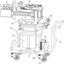 1.一种炉甘石洗液原料黄皮树表皮处理方法,该炉甘石洗液原料黄皮树表皮处理方法采用如下加工设备,该加工设备包括有车底板、移动车轮、推动杆架、电动升降台和连接顶架板;车底板底部安装有四个移动车轮;车底板右侧焊接有推动杆架;车底板顶中部安装有电动升降台;电动升降台的伸缩端顶部安装有连接顶架板;其特征是:还包括有藤类割断系统、藤类分离系统和蕨类藓类清除系统;连接顶架板顶部安装有藤类割断系统;连接顶架板上部前侧和上部后侧各安装有一组藤类分离系统;连接顶架板前侧底部和后侧底部各安装有一组蕨类藓类清除系统;
