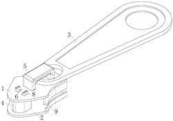 当用户拉动拉链卡住衣物或线头难以拉动拉链时,此时通过人手向靠近凹槽(7)中轴线方向捏动弹性金属块(8)于伸出滑槽(6)上方的一部分,当弹性金属块(8)于远离上板(1)侧壁一侧表面接触滑槽(6)于远离上板(1)侧壁一侧表面时,此时向上拉动拉片(3),使得上板(1)向上方运动,当弹性金属块(8)于水平方向下表面低于上板(1)上表面时,此时松手,之后接着向上拉动拉片(3)直至弹性金属块(8)完全滑出滑槽(6)与上板(1)脱离,此时上板(1)与下板(2)分离,即可解决衣服的布料或线头卡进拉链头及链牙之间的问题;