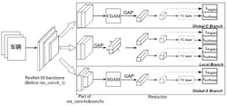 1.一种用于车辆重识别的全局注意力网络模型,其特征在于:包括一个骨干网、一个将特征图划分成两部分的局部分支和两个具有全局注意力模块的全局分支;所述骨干网络分裂为3个分支;所述全局注意力网络模型在每个分支最终输出的特征图上使用全局平均池化GAP得到特征向量;所述局部分支,仅将车辆特征图水平划分成两部分。
