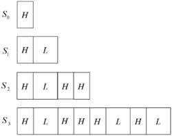 1.一种基于周期倍增光子晶体的多通道滤波器,其特征在于,所述多通道滤波器中周期倍增序列的排列规则为:S0=H,S1=HL,S2=HLHH,……,SN=SN-1SN-2SN-2,……,其中N是周期倍增序列的序号,SN表示周期倍增序列的第N项;其中,H为第一电介质层,L为第二电介质层,第一电介质层和第二电介质层为两种折射率不同的均匀电介质;第一电介质层和第二电介质层的厚度分别为各自折射率对应的1/4光学波长。