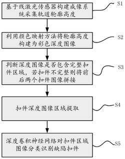 6.如权利要求1所述的轨道弹条扣件缺陷识别方法,其特征在于,还包括:判断轮廓彩色深度图像中是否包含完整弹条扣件区域;若弹条扣件区域不完整,则将相邻的包含不完整弹条扣件区域的轮廓彩色深度图像进行拼接,形成包含完整弹条扣件区域的轮廓彩色深度图像。