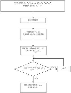 分别表示中继和基站分配的功率, 分别表示用户的信噪比,初始化迭代容忍因子ε和最大迭代次数qmax,将功率分配初始值设置为0,每一次计算能效值并更新λn,直到两次迭代单位模值之差小于迭代容忍因子或达到最大迭代次数,输出功率值。