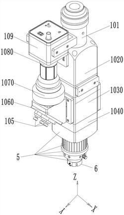 激光光纤连接头(101)、扩束准直透镜组部件(1020)、分光镜部件(1030)、多焦点聚焦透镜部件(1040)、水光耦合腔三坐标移动调节部件(5)、水光耦合腔部件(6)依次从上到下安装在同一垂直线上;