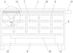 1.一种血液科血液储存装置,包括壳体(1)、控制器(2)、电控门(3)、RFID读写器(4)、第一隔板(6)、第二隔板(7)、制冷设备(11)和消毒灯(44);壳体(1)的内部由下往上设置有电器元件安装室(8)、血液储存室(9)和操控室(10);第一隔板(6)将血液储存室(9)分隔为多个血液储存区;第二隔板(7)将血液储存区分隔为多个血液储存间;制冷设备(11)设置在电器元件安装室(8),且与各血液储存间连通;消毒灯(44)设置在血液储存室(9);电控门(3)和RFID读写器(4)均设置在壳体(1)的投递口上;其特征在于,还包括存取组件;存取组件设置在操控室(10);