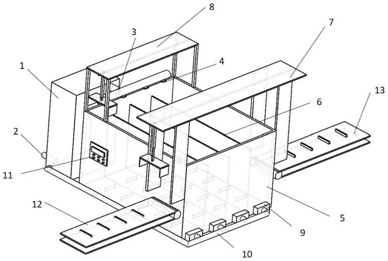 4)当装框渔获物在第一预冷舱隔间堆叠预冷完成后,在第一预冷舱隔间底部传动装置带动下,向舱体另一侧的第二流转组件方向移动,每次移动一个框位继续堆叠,直至装框渔获物满载第一预冷舱隔间;通过第二流转组件转移至其他隔间继续预冷;
