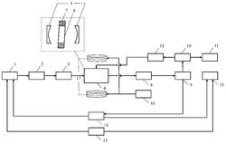 1.基于铁磁薄膜与法布里珀罗腔的磁场传感系统,其特性在于:包括可调谐激光器(1)、光衰减器(2)、偏振控制器(3)、传感单元(4)、光电探测器(8)、偏置三通(9)、分束器(10)、频谱分析仪(11)、网络分析仪(12)、示波器(13)、伺服控制器(14)、信号发生器(15)、电流源(16)、线圈(17),其中传感单元(4)包括法布里珀罗腔(5)、钇铁石榴石薄膜(6)、微带线(7);