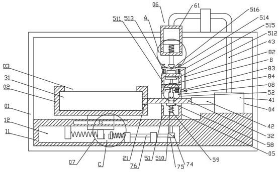 1.一种VR眼镜镜片真空包装设备,其特征在于,包括:工作台;放置框,活动设置在工作台上,内部可拆卸安装有袋装组件,且袋装组件包括袋体和抽气端;真空包装组件,连接所述袋装组件,用于将袋装组件内部抽真空;密封组件,安装在放置框上,用于抽真空完成后对袋装组件进行密封;所述密封组件包括箱体、支撑件和密封件;其中,支撑件,活动安装在所述箱体内,用于对袋装组件的抽气端进行支撑;密封件,活动安装在所述箱体内,且与所述支撑件位于不同侧,用于对袋装组件的抽气端进行密封;顶压组件,连接真空包装组件和密封组件,用于在抽真空过程中带动密封件在箱体内活动,以对袋装组件的抽气端进行密封;所述顶压组件包括:集气件,与所述真空包装组件连通,用于收集抽出的空气;顶压件,活动设置在集气件上,用于带动密封件在竖直方向上移动;所述集气件包括固定安装在工作台上的连接箱,连接箱与第二连接管的一端连通,抽真空机抽出的气体通过第二连接管进入到连接箱中,带动顶压件在竖直方向上移动;所述连接箱上设有通气孔,排出连接箱内的气体;所述顶压件包括活动设置在连接箱内的活动板,活动板与顶杆的一端固定连接,顶杆的另一端与顶针固定连接,当活动板在竖直方向上移动时能够带动顶针也在竖直方向上移动,顶针与固定在U型架上的固定板配合使用,当顶针向下移动时能够带动固定板向下移动,带动密封件向下移动;所述活动板与连接箱之间通过第四弹簧连接。2.根据权利要求1所述的VR眼镜镜片真空包装设备,其特征在于,所述抽气端上设有与密封件相配合的搭配件,通过与密封件的配合对抽气端进行密封。3.根据权利要求1所述的VR眼镜镜片真空包装设备,其特征在于,所述支撑件包括:支撑体,活动安装在所述箱体内,用于对抽气端进行支撑;伸缩件,连接所述支撑体,用于密封时带动支撑体在竖直方向上移动。4.根据权利要求1所述的VR眼镜镜片真空包装设备,其特征在于,所述密封件包括:密封体,用于与抽气端配合使用,以对抽气端进行密封;插设件,活动设置在所述密封体上,用于将密封体插设在抽气端上;第一驱动件;活动安装在箱体上,用于带动密封件在竖直方向上移动。5.根据权利要求1所述的VR眼镜镜片真空包装设备,其特征在于,还包括:第一活动组件,安装在所述工作台内,用于带动放置框在水平方向上移动;其中,所述第一活动组件包括:活动件,安装在放置框一侧,用于带动放置框在水平方向上移动;第二驱动件,安装在所述工作台内,用于带动活动架在水平方向上移动,且与所述支撑件配合使用。6.根据权利要求5所述的VR眼镜镜片真空包装设备,其特征在于,所述活动件包括连接部和配合部;其中,连接部,连接所述放置框,用于带动放置框在水平方向上移动;