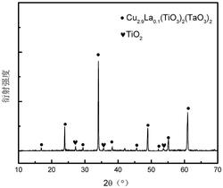 6.根据权利要求4所述的制备方法,其特征在于:步骤(2)配置所述溶液1时加入的柠檬酸与其中金属阳离子的摩尔比为5:1;步骤(3)中,先根据化学式Cu3‑xLax(TiO3)2(TaO3)2,按化学计量比分别称取硝酸镧或其水合物、硝酸铜或其水合物、钛酸丁酯备用,在配置所述溶液2时加入的柠檬酸与其中金属阳离子的摩尔比为5:1;步骤(4)中,在配置所述溶液3时加入的柠檬酸与其中金属阳离子的摩尔比为5:1。