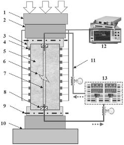 b在煤岩试样(5)的导水通道(7)顶底部分别通过柔性密封体(8)连接两根管路作为渗流通道(11),导水通道(7)顶部通过渗流通道(11)与渗流控制主机(13)的输出端连接,导水通道(7)底部通过渗流通道(11)与渗流控制主机(13)的输入端连接;