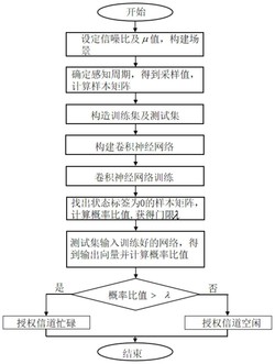 步骤8:将测试集中的每个样本矩阵对应的输出向量的概率比值作为检验统计量;然后将每个检验统计量与λ进行比较,对于任一个检验统计量,如果该检验统计量大于λ,则判定该检验统计量对应的样本矩阵所对应的感知周期内主用户信号到达,即授权信道忙碌;否则,判定该检验统计量对应的样本矩阵所对应的感知周期内主用户信号离开,即授权信道空闲。