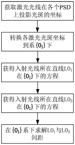 1.用于机器人自标定的激光光线间距测量方法,其特征是,该方法包括以下步骤:步骤1、获取激光光线在各个PSD上投影光斑的坐标;