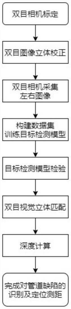 1.一种基于目标检测及双目视觉的管道缺陷识别与定位方法,其特征在于,包括相机标定、立体校正、图像捕获与目标检测、立体匹配与深度计算模块四部分;其步骤如下:步骤一:相机标定:建立相机成像的几何模型,确定空间物体表面上一点的三维几何位置与其在图像中对应点之间的相互关系,由标定板上特征点的图像坐标和世界坐标求解双目摄像机的标定参数,其中,标定参数包括左摄像头和右摄像头的内参、外参和畸变参数;