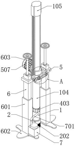 7.根据权利要求1所述的一种城市地下土壤检测用插入式检测仪,其特征在于:所述加长杆(104)的外侧套设有外框架(5),且外框架(5)的左右两端底部均对称固定有内杆(6),所述内杆(6)的下端外侧套设有外套筒(601),且外套筒(601)的底部固定安装有为T字形结构的支撑板(602)。