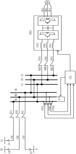 1.一种动车供电传动系统,通过地面牵引供电系统供电,其特征在于:所述动车供电传动系统包括三相供电传动模式和单相供电传动模式,当所述地面牵引供电系统为三相供电制式时,所述动车供电传动系统运行于三相供电传动模式,当所述地面牵引供电系统为单相供电制式时,所述动车供电传动系统运行于单相供电传动模式;包括测控器CTL,当所述测控器CTL检测到地面牵引供电系统为三相供电制式时,所述测控器CTL控制所述动车供电传动系统运行于三相供电传动模式,当所述测控器CTL检测到地面牵引供电系统为单相供电制式时,所述测控器CTL控制所述动车供电传动系统运行于单相供电传动模式;还包括切换供电传动模式的转换开关K,所述转换开关K并联在两根供电母线之间,实现将三相供电母线中的两根并联与第三根形成单相回路。