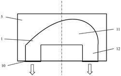 1.单管前端双光束平行输出超辐射发光二极管,自上而下依次是上电极(1)、覆盖层(2)、上限制层(3)、上波导(4)、有源层(5)、下波导(6)、下限制层(7)、衬底(8)、下电极(9),其中,由下电极(9)、衬底(8)、下限制层(7)、下波导(6)、有源层(5)构成超辐射发光二极管的立方体状主体,所述主体的各层长度、宽度相同,厚度不同;其特征在于,由上波导(4)、上限制层(3)、覆盖层(2)、上电极(1)构成所述超辐射发光二极管的组合波导,所述组合波导由一个曲率渐变区域波导(11)与两个输出波导(12)构成,两个输出波导(12)走向彼此平行,且分别位于曲率渐变区域波导(11)的前左端、前右端,曲率渐变区域波导(11)的俯视形状为由一条曲率渐变曲线和一条直线围拢的图形,所述组合波导在主体上一次刻蚀而成,有源层(5)前端面与所述两个输出波导(12)各自的前端面对应的部分均为出光窗口(10),两个出光窗口(10)制作有相同的抗反射涂层。