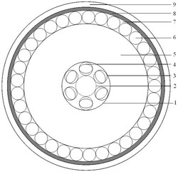 1.一种具有异质结构双包层的空芯反谐振光纤,其特征在于:包括空芯反谐振光纤单元(1)、套接在空芯反谐振光纤单元(1)外层的内包层(5)、套接在内包层(5)外层的外包层(7)、套接在外包层(7)外层的石英玻璃支撑管(8)和套接在石英玻璃支撑管(8)外层的聚合物涂层(9);空芯反谐振光纤单元(1)包括空气纤芯(2)和六个相同尺寸的内部嵌套椭圆反谐振管(4)的包层圆管(3),包层圆管(3)围绕空气纤芯(2)设置,包层圆管(3)之间的间隔距离相同,椭圆反谐振管(4)的管壁厚度与包层圆管(3)的管壁厚度相同,空气纤芯( 2 ) 区域的内部及其它空芯反谐振光纤单元(1)内部的空间均为空气;外包层(7)由33个尺寸相同的圆管(6)组成,圆管(6)围绕内包层(5)设置,圆管(6)与包层圆管(3)的厚度和材料一致。