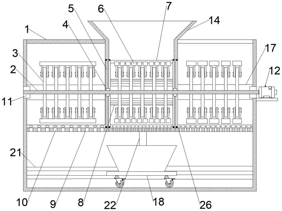 筛板,平行设置在转动杆的正下方,两端分别固定在处理箱相对的内侧壁上,两个护板底端的端部分别滑动在筛板两侧部,每段转动杆下侧的筛板上开有多个与同段破碎锤尺寸对应的筛孔;